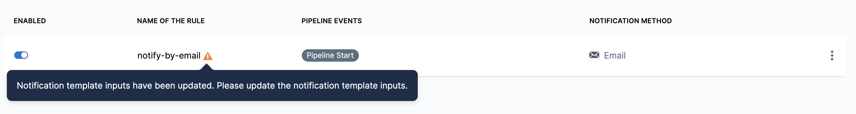 When a template used in a pipeline-level notification rule configured through the Custom Notification tab is updated, a warning message will appear when you attempt to run the pipeline: